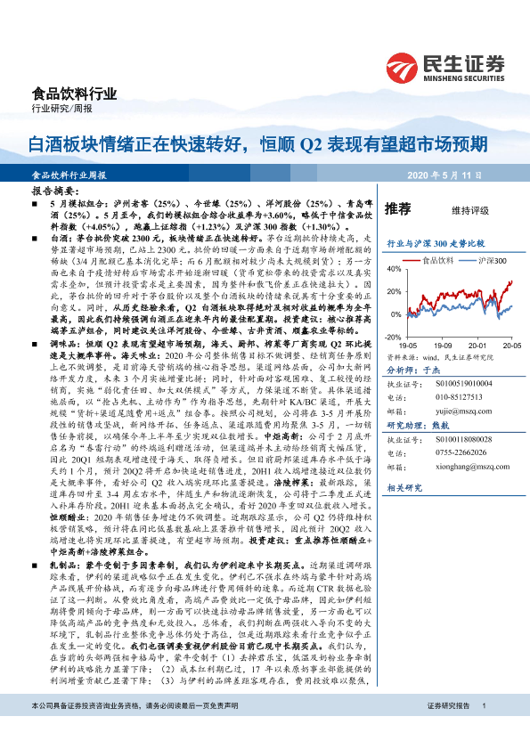 【民生证券】【20200511】食品饮料行业周报:白酒板块情绪正在快速转好,恒顺Q2表现有望超市场预期-25页
