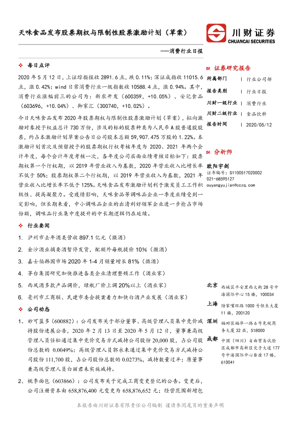 【川财证券】【20200512】天味食品发布股票期权与限制性股票激励计划(草案)-3页