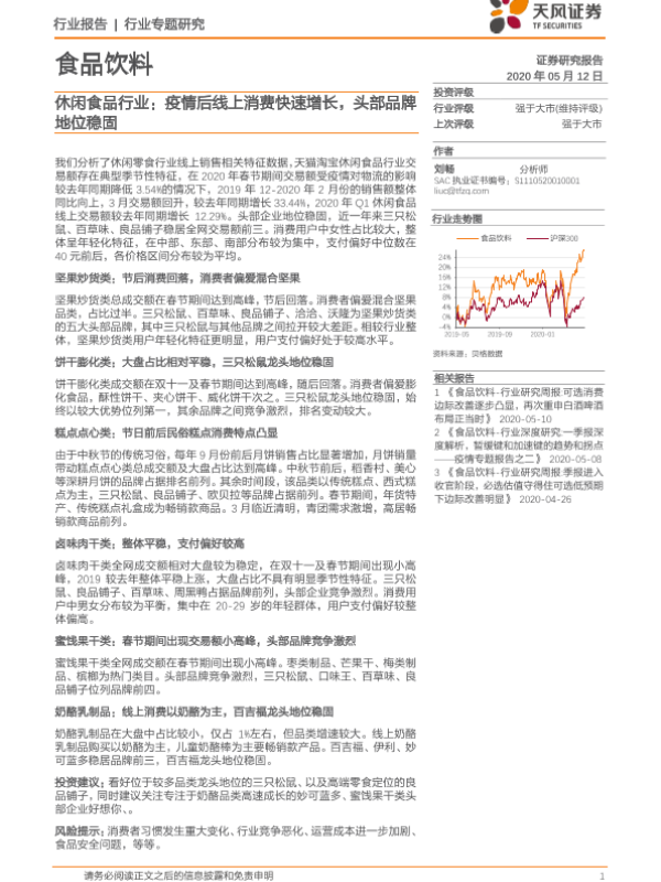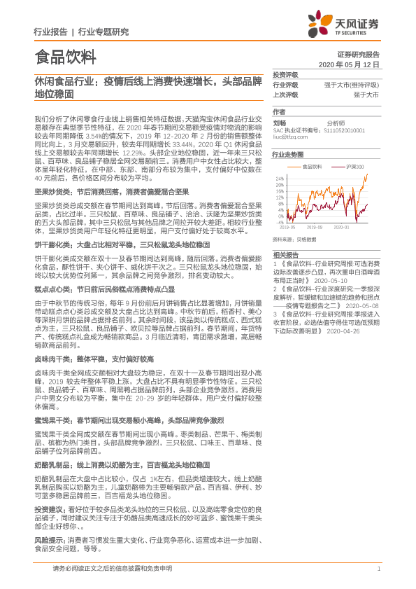 【天风证券】【20200512】食品饮料行业专题研究:休闲食品行业:疫情后线上消费快速增长,头部品牌地位稳固-13页