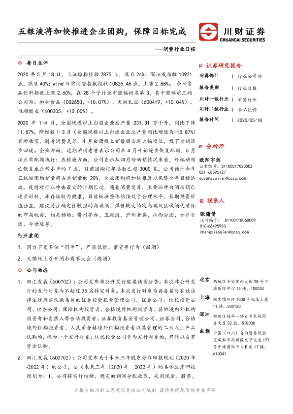 【川财证券】【20200518】消费行业日报:五粮液将加快推进企业团购,保障目标完成-3页