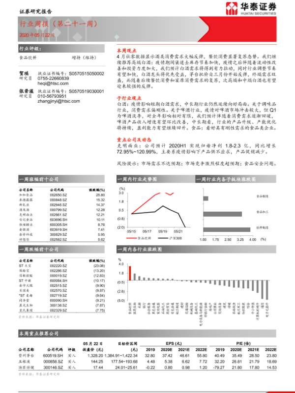 【华泰证券】【20200522】20200522-华泰证券-食品饮料行业周报(第二十一周)-9页
