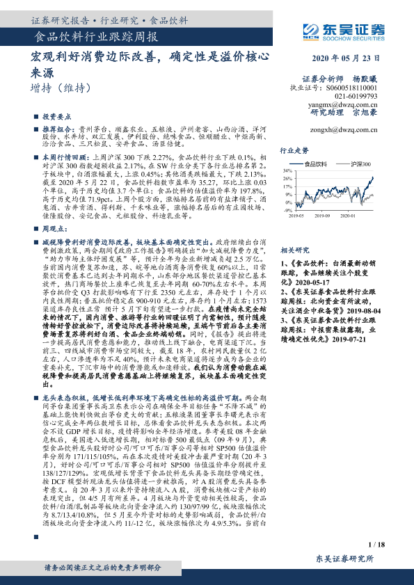 【东吴证券】【20200523】食品饮料行业跟踪周报:宏观利好消费边际改善,确定性是溢价核心来源-18页