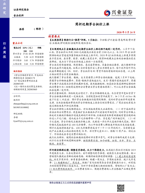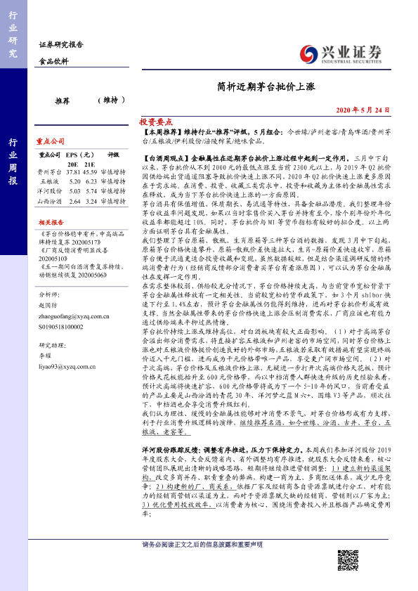 【兴业证券】【20200524】20200524-兴业证券-食品饮料行业周报:简析近期茅台批价上涨-18页