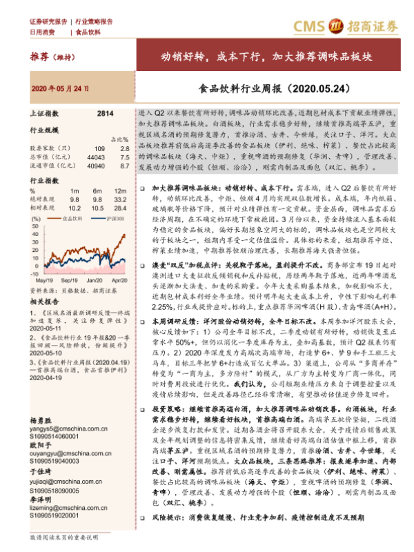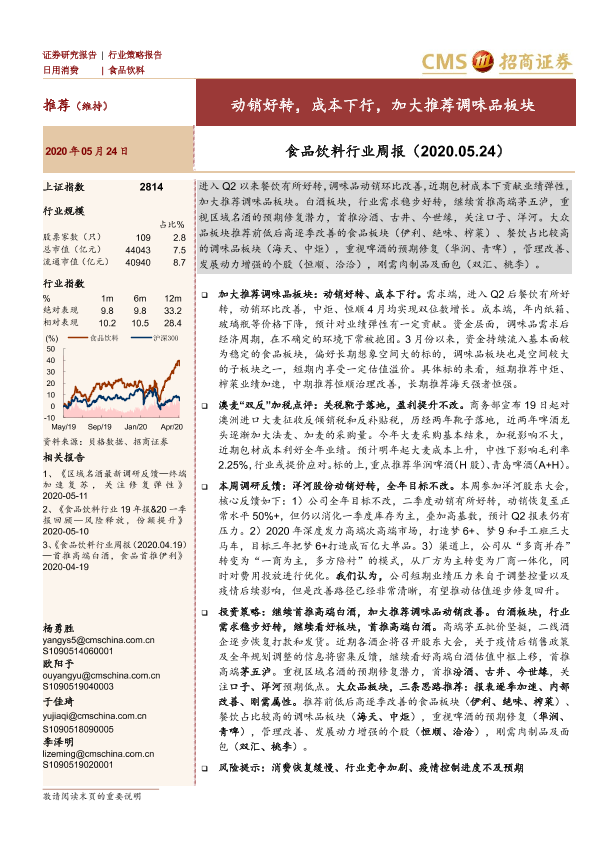【海通证券】【20200524】食品饮料行业周报:动销好转,成本下行,加大推荐调味品板块-9页