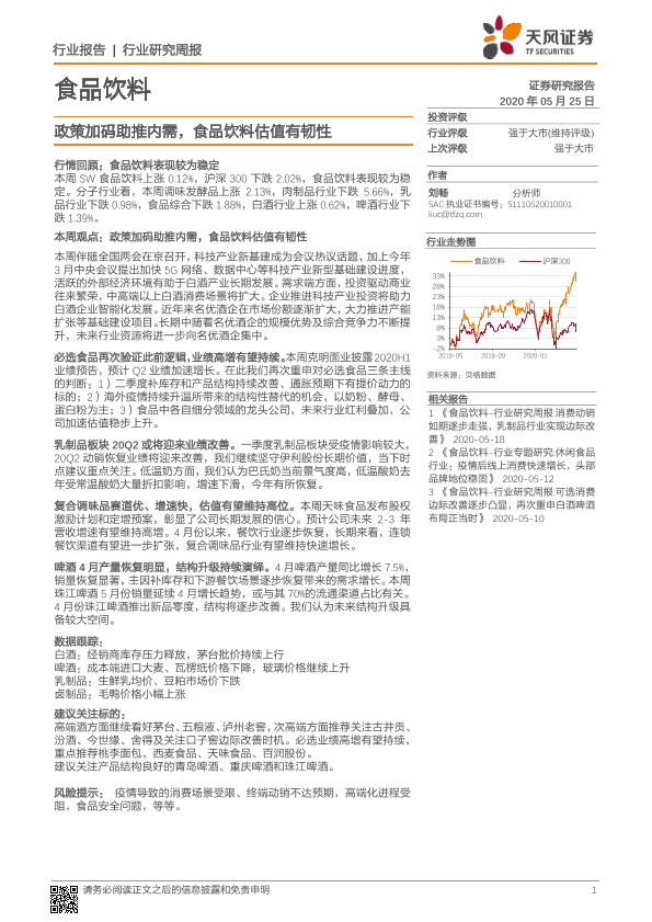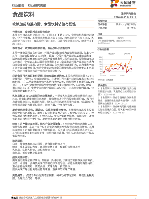 【天风证券】【20200525】食品饮料行业研究周报:政策加码助推内需,食品饮料估值有韧性-10页