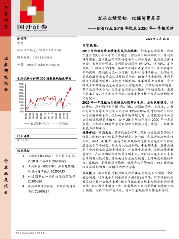 【国开证券】【20200525】白酒行业2019年报及2020年一季报总结:龙头业绩坚韧,把握消费复苏-27页