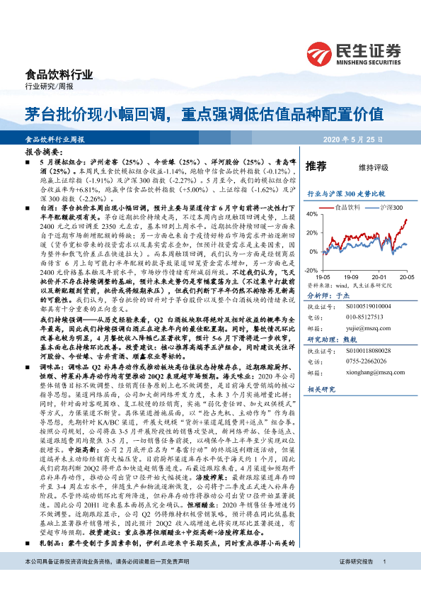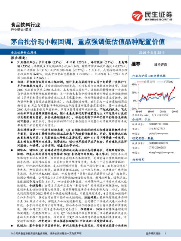 【民生证券】【20200525】20200525-民生证券-食品饮料行业周报:茅台批价现小幅回调,重点强调低估值品种配置价值-29页