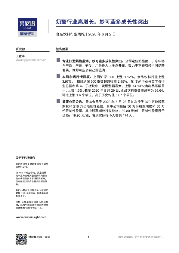 【莫尼塔研究】【20200602】食品饮料行业周报:奶酪行业高增长,妙可蓝多成长性突出-4页