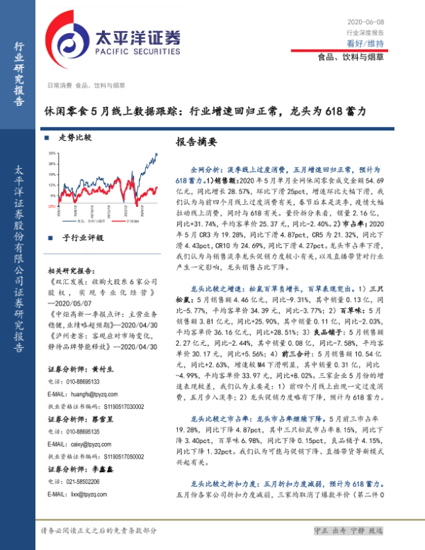 【太平洋证券】【20200608】20200608-太平洋-食品、饮料与烟草行业深度报告:休闲零食5月线上数据跟踪:行业增速回归正常,龙头为618蓄力-7页