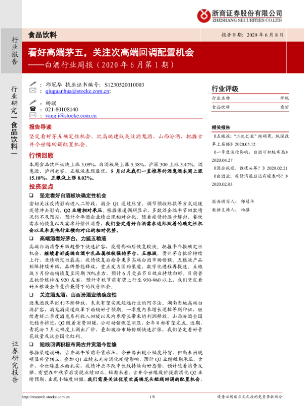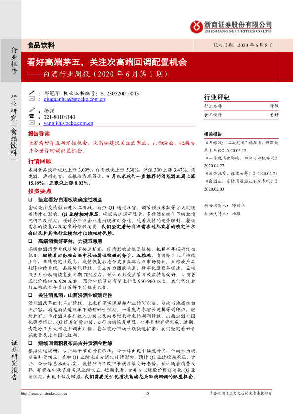 【浙商证券】【20200608】20200608-浙商证券-食品饮料:白酒行业周报(2020年6月第1期):看好高端茅五,关注次高端回调配置机会-8页
