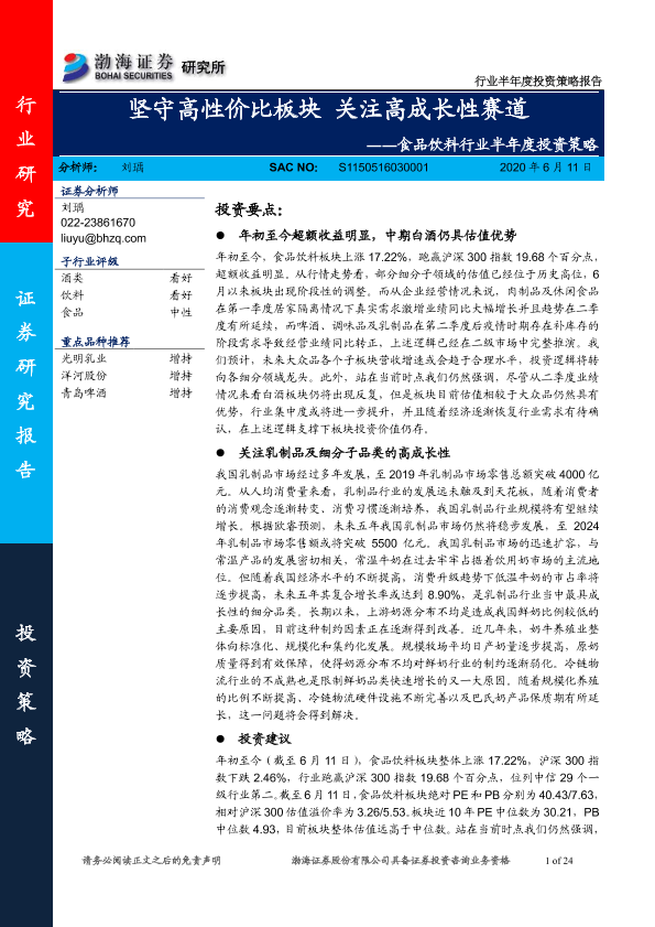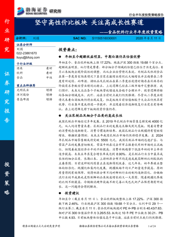 【渤海证券】【20200611】20200611-渤海证券-食品饮料行业半年度投资策略:坚守高性价比板块 关注高成长性赛道-24页