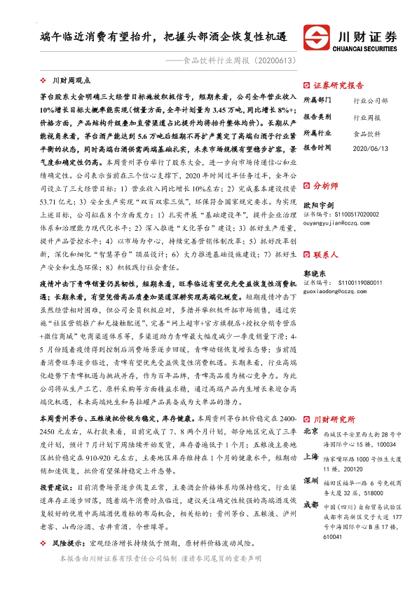 【川财证券】【20200613】20200613-川财证券-食品饮料行业周报:端午临近消费有望抬升,把握头部酒企恢复性机遇-13页