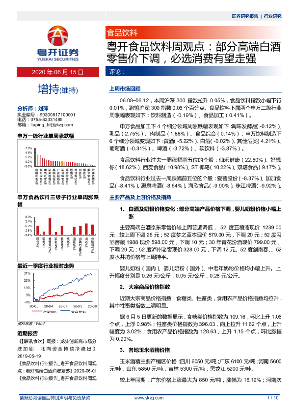 【粤开证券】【20200615】粤开食品饮料周观点:部分高端白酒零售价下调,必选消费有望走强-10页