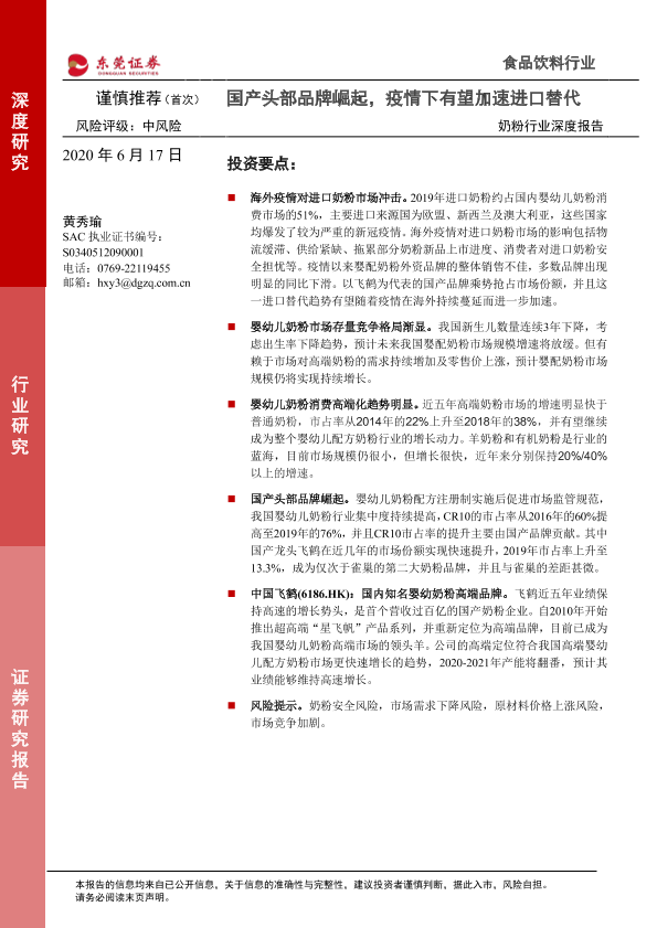 【东莞证券】【20200617】奶粉行业深度报告:国产头部品牌崛起,疫情下有望加速进口替代-20页