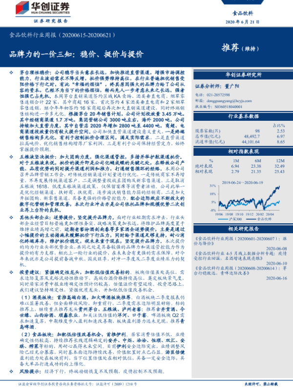 【华创证券】【20200621】食品饮料行业周报:品牌力的一价三知:稳价、挺价与提价-4页