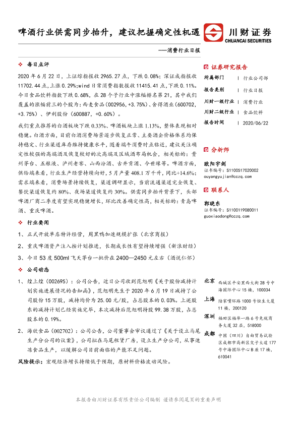 【川财证券】【20200622】消费行业日报:啤酒行业供需同步抬升,建议把握确定性机遇-3页