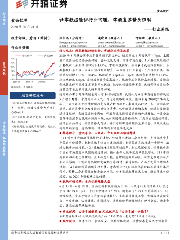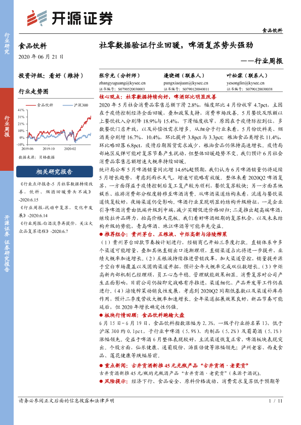 【开源证券】【20200621】20200621-开源证券-食品饮料行业周报:社零数据验证行业回暖,啤酒复苏势头强劲-11页