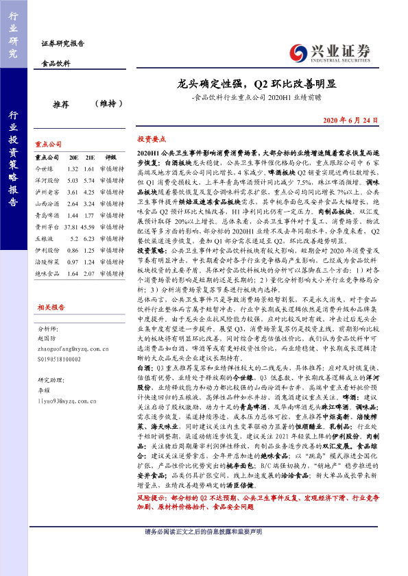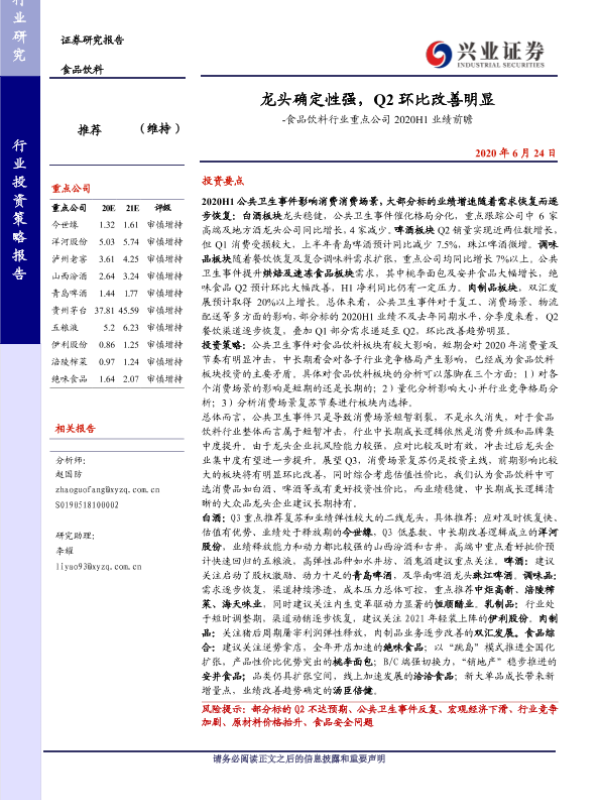 【兴业证券】【20200624】龙头确定性强,Q2环比改善明显 - 食品饮料行业重点公司2020H1业绩前瞻-7页