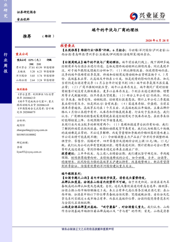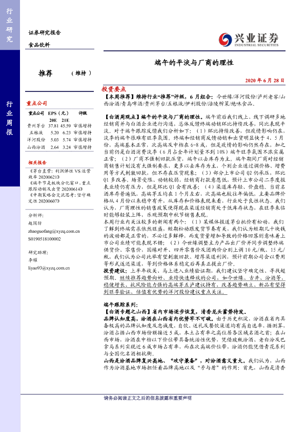 【兴业证券】【20200628】20200628-兴业证券-食品饮料行业周报:端午的平淡与厂商的理性-18页
