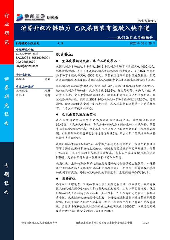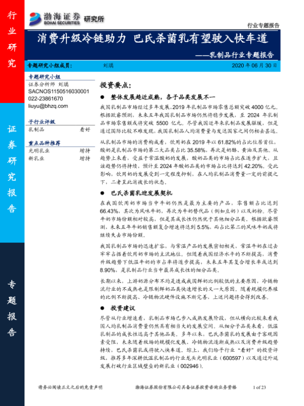 【渤海证券】【20200630】乳制品行业专题报告:消费升级冷链助力 巴氏杀菌乳有望驶入快车道-23页