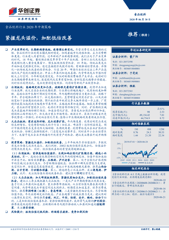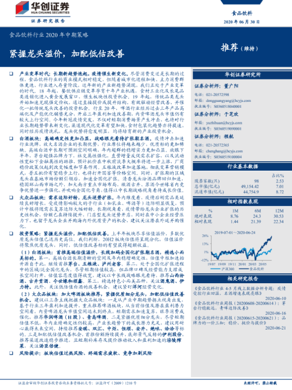 【华创证券】【20200630】食品饮料行业2020年中期策略:紧握龙头溢价,加配低估改善-32页