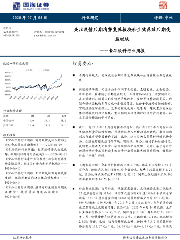 【国海证券】【20200705】20200705-国海证券-食品饮料行业周报:关注疫情后期消费复苏板块和生猪养殖后期受益板块-18页