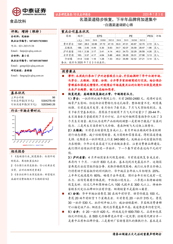 【中泰证券】【20200705】20200705-中泰证券-白酒渠道调研心得:名酒渠道稳步恢复,下半年品牌将加速集中-4页