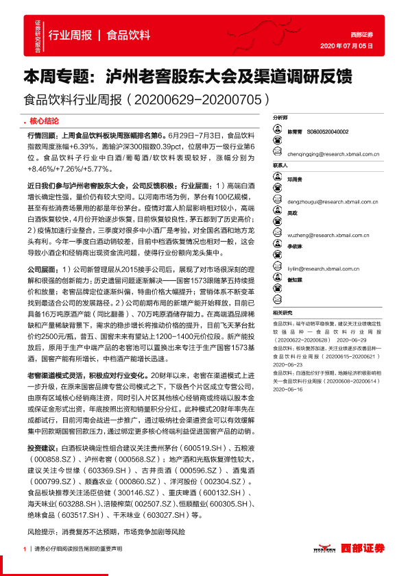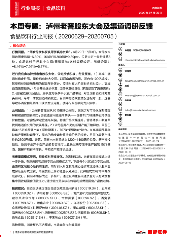 【西部证券】【20200705】20200705-西部证券-食品饮料行业周报:本周专题:泸州老窖股东大会及渠道调研反馈-16页