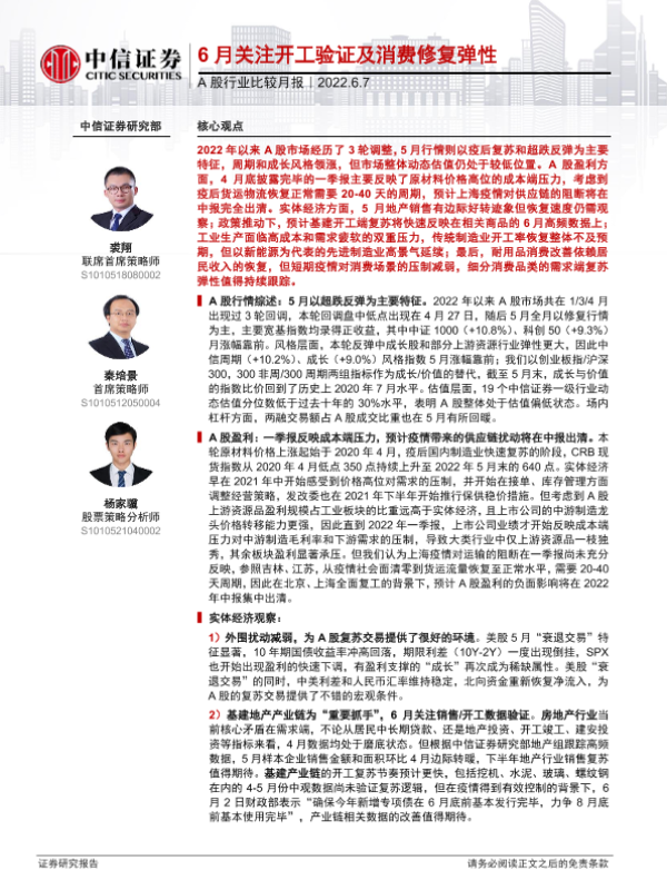 【中信证券】【20220607】A股行业比较月报:6月关注开工验证及消费修复弹性-29页