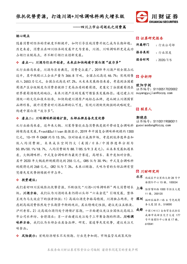 【川财证券】【20200705】食品饮料:四川上市公司巡礼之消费篇-依托优势资源,打造川酒+川味调味料两大增长极-84页