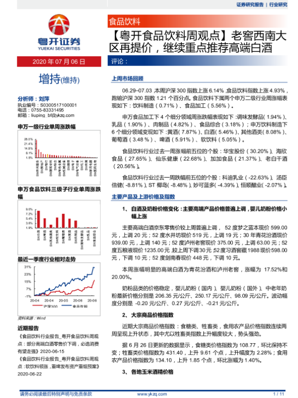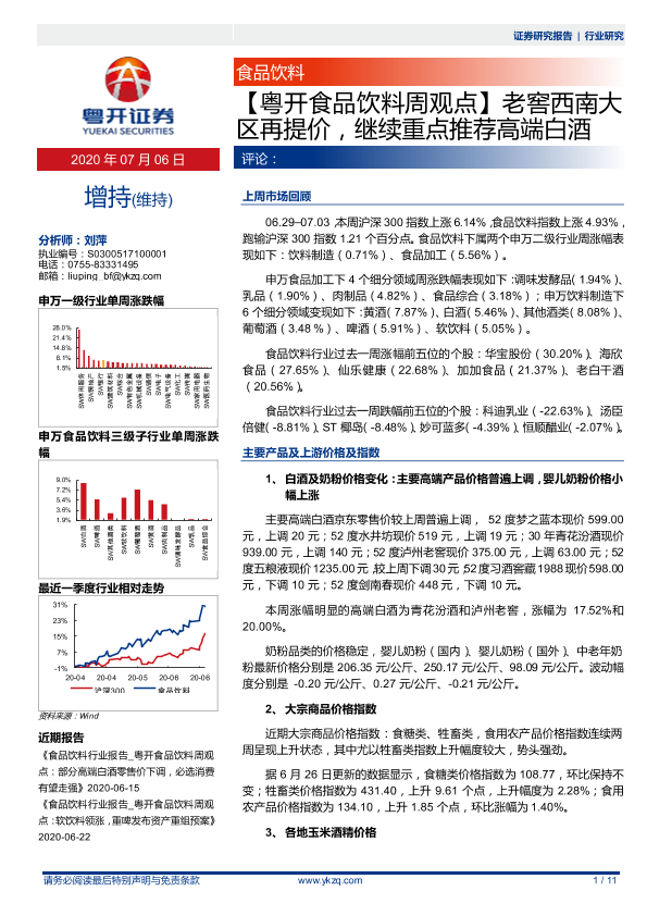 【粤开证券】【20200706】粤开食品饮料周观点:老窖西南大区再提价,继续重点推荐高端白酒-11页