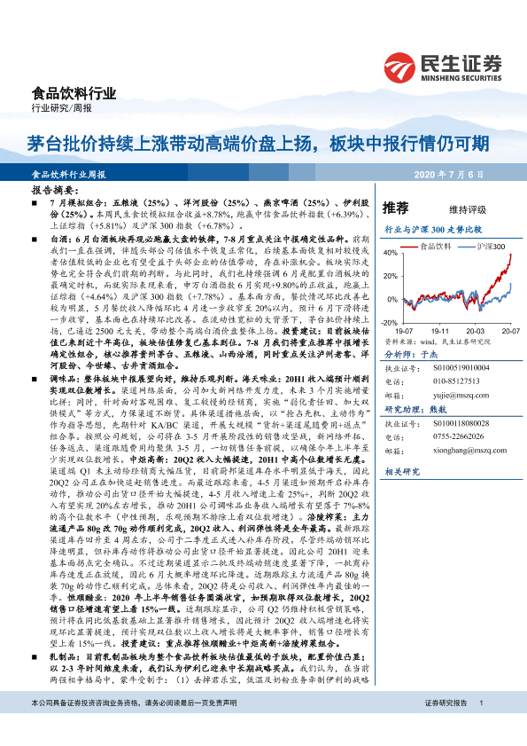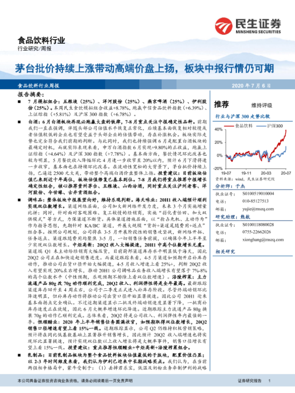 【民生证券】【20200706】20200706-民生证券-食品饮料行业周报:茅台批价持续上涨带动高端价盘上扬,板块中报行情仍可期-32页