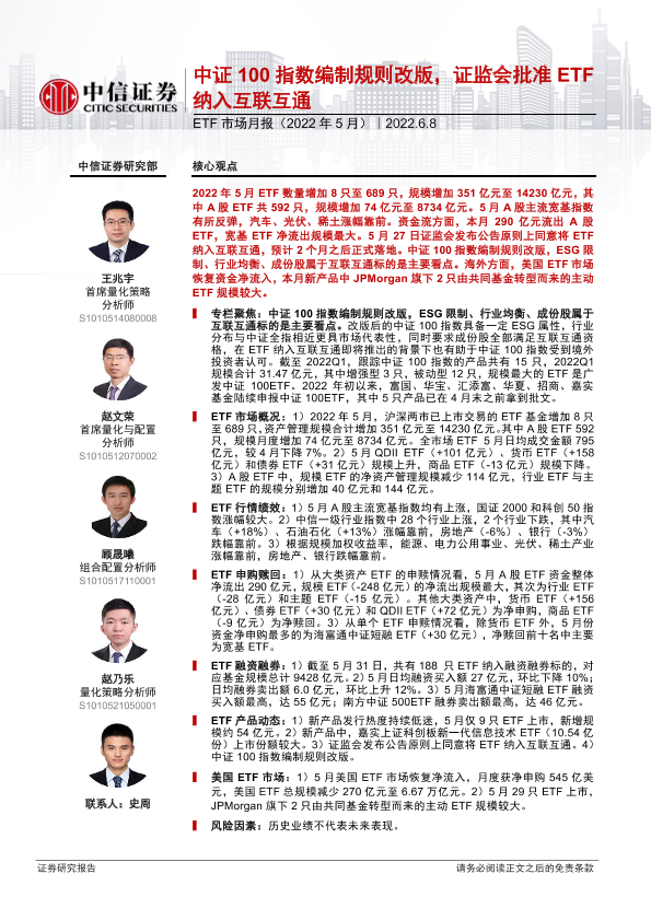 【中信证券】【20220608】ETF市场月报(2022年5月):中证100指数编制规则改版,证监会批准ETF纳入互联互通-24页