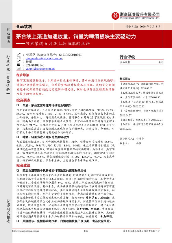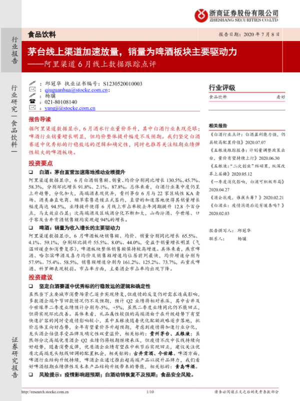 【浙商证券】【20200708】阿里渠道6月线上数据跟踪点评:茅台线上渠道加速放量,销量为啤酒板块主要驱动力-10页