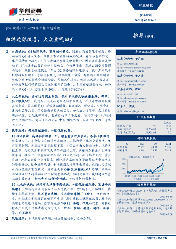【华创证券】【20200714】食品饮料行业2020年中报业绩前瞻:白酒边际改善,大众景气回升-12页