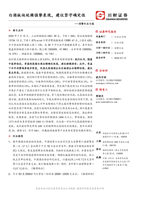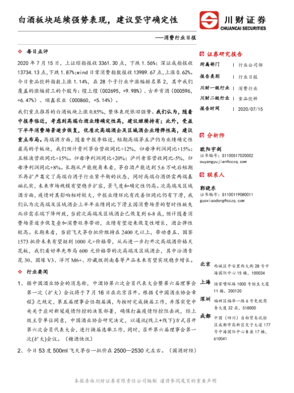 【川财证券】【20200715】消费行业日报:白酒板块延续强势表现,建议坚守确定性-4页