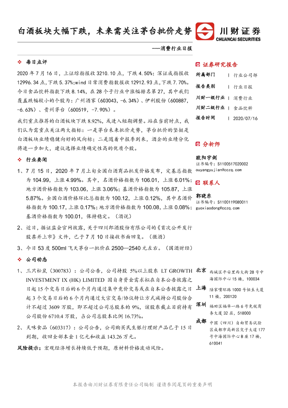 【川财证券】【20200716】消费行业日报:白酒板块大幅下跌,未来需关注茅台批价走势-3页