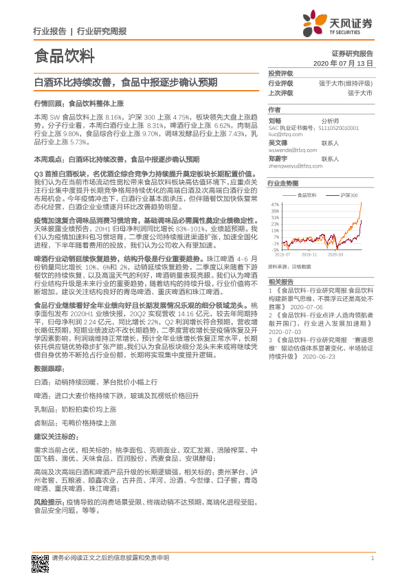 【天风证券】【20200713】食品饮料行业研究周报:白酒环比持续改善,食品中报逐步确认预期-9页