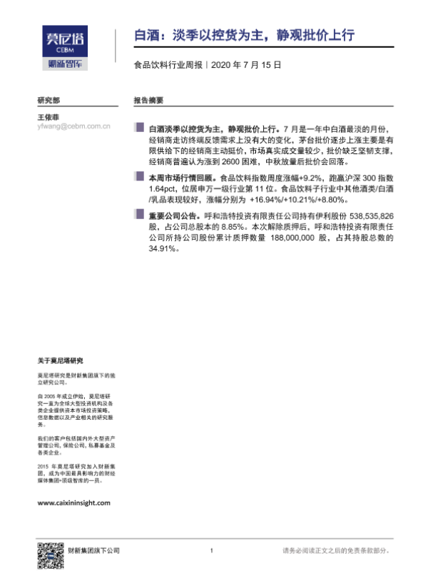 【莫尼塔研究】【20200715】食品饮料行业周报:白酒:淡季以控货为主,静观批价上行-5页