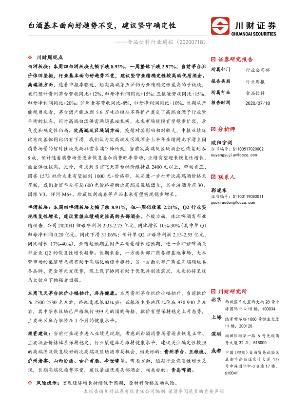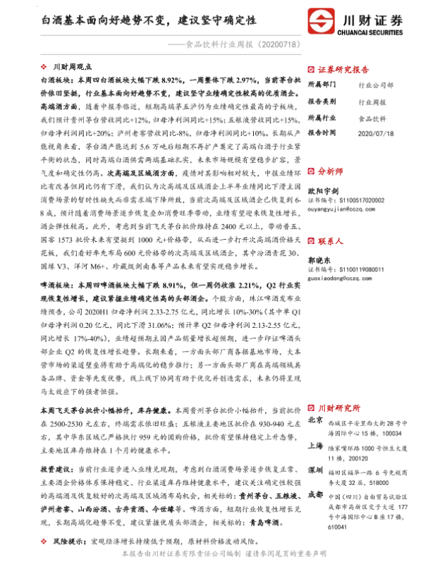 【川财证券】【20200718】20200718-川财证券-食品饮料行业周报:白酒基本面向好趋势不变,建议坚守确定性-13页