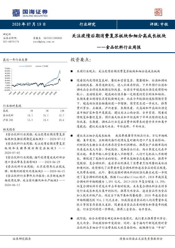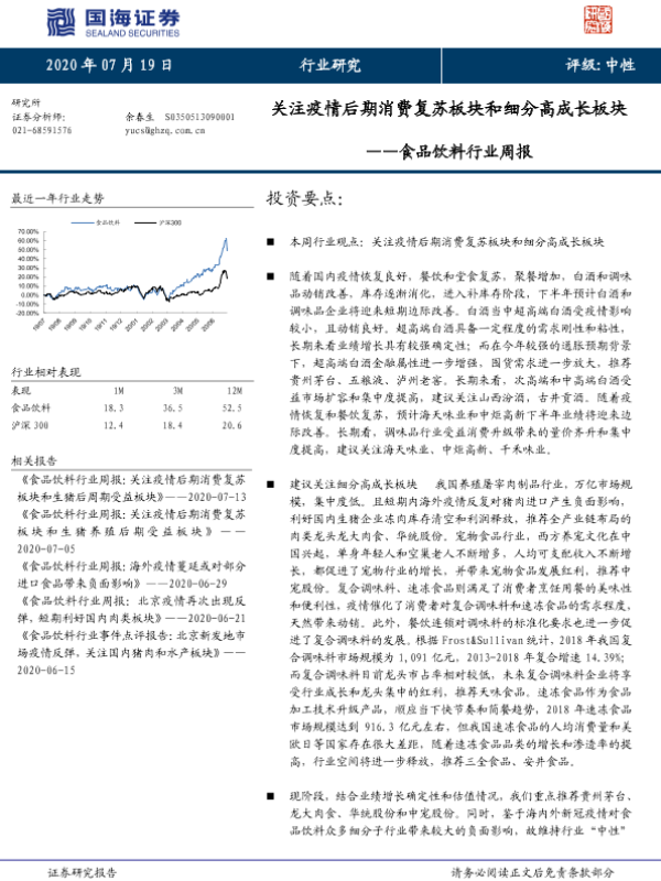 【国海证券】【20200719】20200719-国海证券-食品饮料行业周报:关注疫情后期消费复苏板块和细分高成长板块-19页