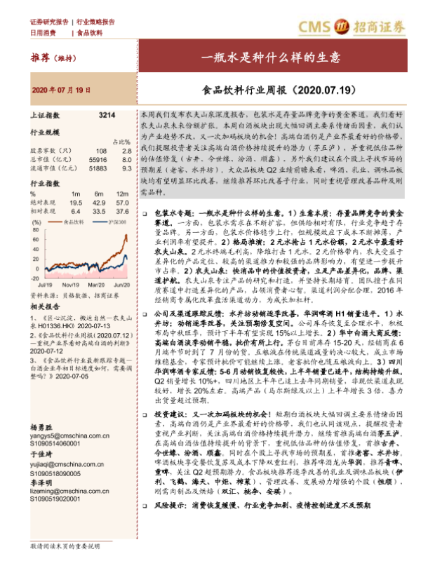 农夫山泉 包装水 行业周报 食品饮料 高端白酒