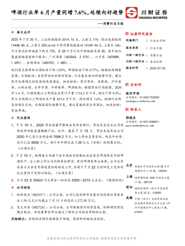【川财证券】【20200720】消费行业日报:啤酒行业单6月产量同增7.6%,延续向好趋势-3页