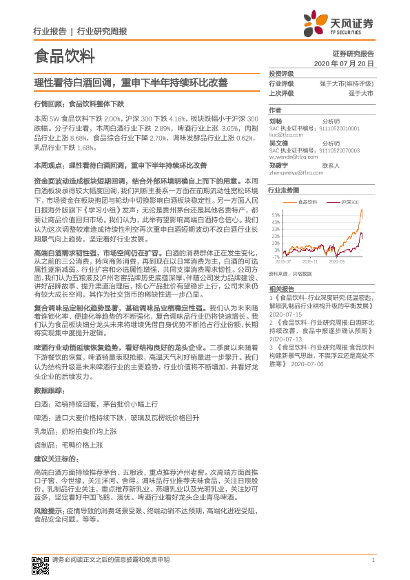 【天风证券】【20200720】20200720-天风证券-食品饮料行业研究周报:理性看待白酒回调,重申下半年持续环比改善-10页