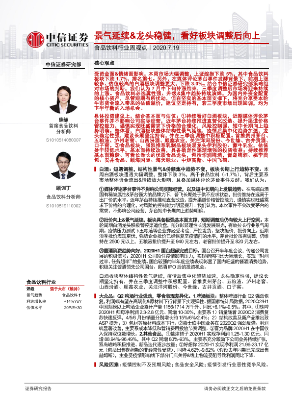 【中信证券】【20200719】20200719-中信证券-食品饮料行业周观点:景气延续&龙头稳健,看好板块调整后向上-10页