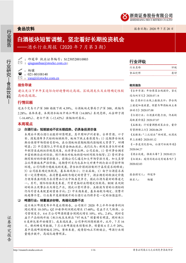 【浙商证券】【20200720】20200720-浙商证券-酒水行业周报(2020年7月第3期):白酒板块短暂调整,坚定看好长期投资机会-16页