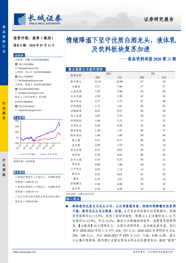 【长城证券】【20200721】食品饮料周报2020第28期:情绪降温下坚守优质白酒龙头,液体乳及饮料板块复苏加速-13页