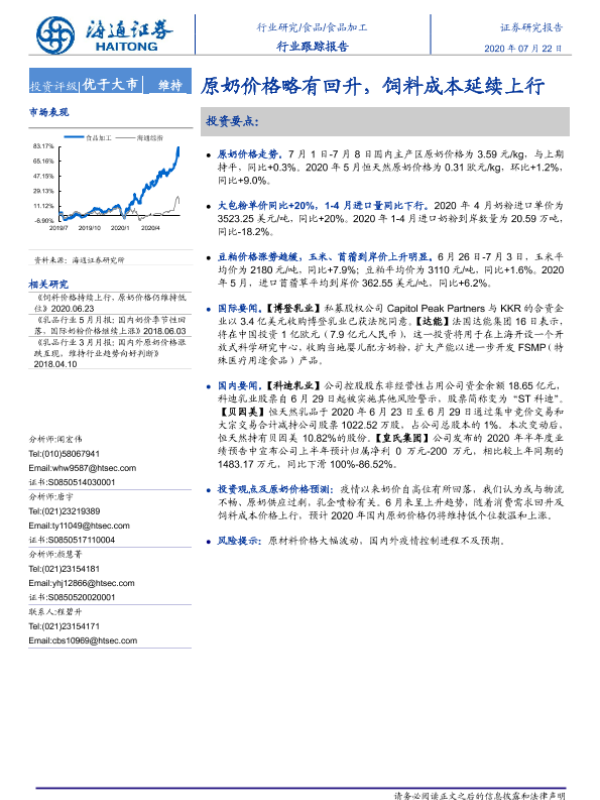 【海通证券】【20200722】食品加工行业跟踪报告:原奶价格略有回升,饲料成本延续上行-9页