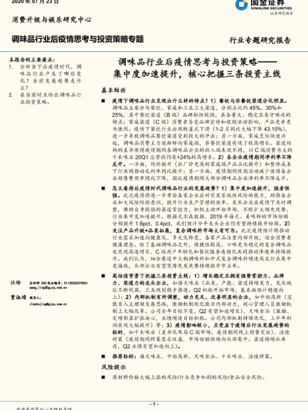 【国金证券】【20200723】调味品行业后疫情思考与投资策略:集中度加速提升,核心把握三条投资主线-18页