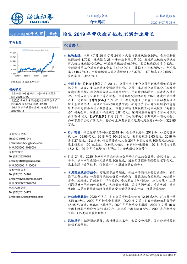 【海通证券】【20200726】20200726-海通证券-食品行业周报:怡宝2019年营收逾百亿元,利润加速增长-7页